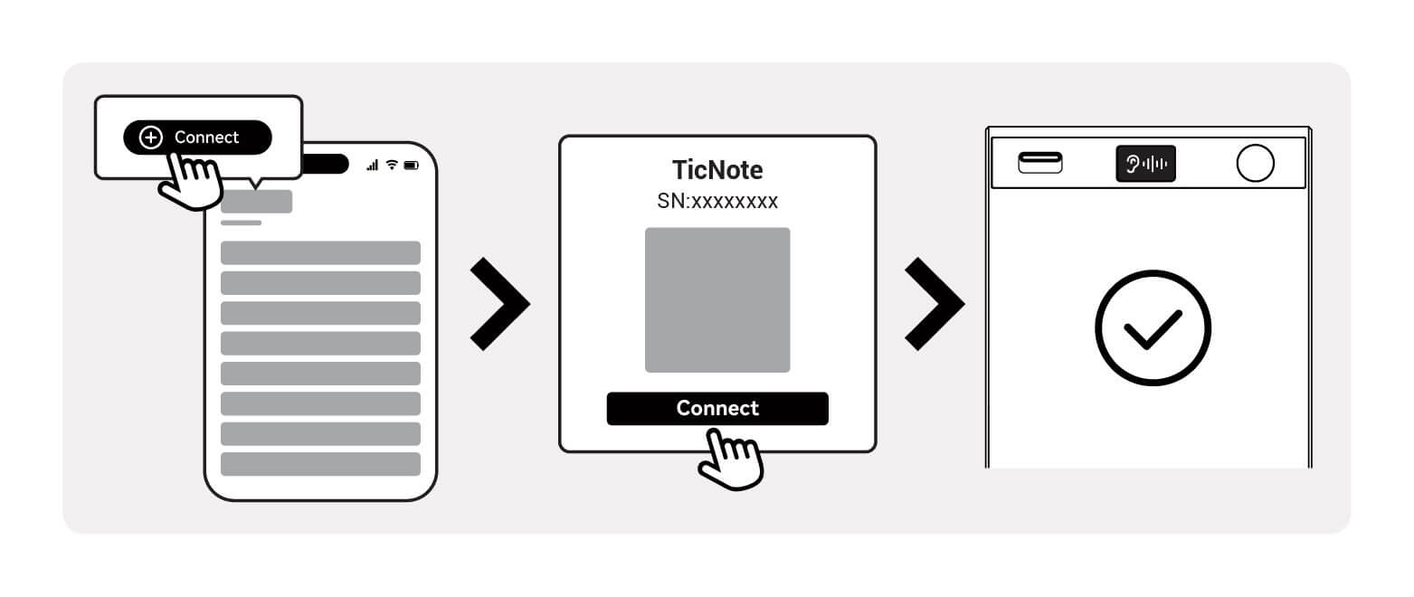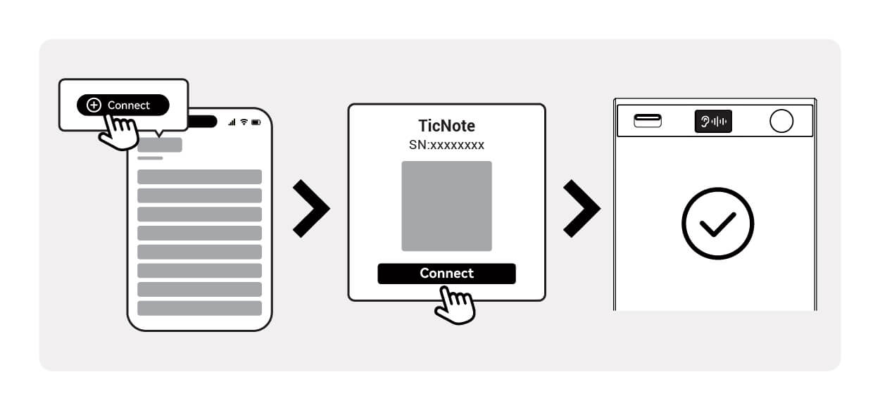 Long press the TicNote Card power button for 0.5 seconds to turn on, the device will vibrate for feedback, but the screen will not show any changes. At this time, open the APP, click the "+ Add Device" button on the homepage, the system will automatically search for nearby TicNote devices. After completing the connection, a waiting recording icon (speaker or earpiece mode corresponding icon) will appear on the TicNote device